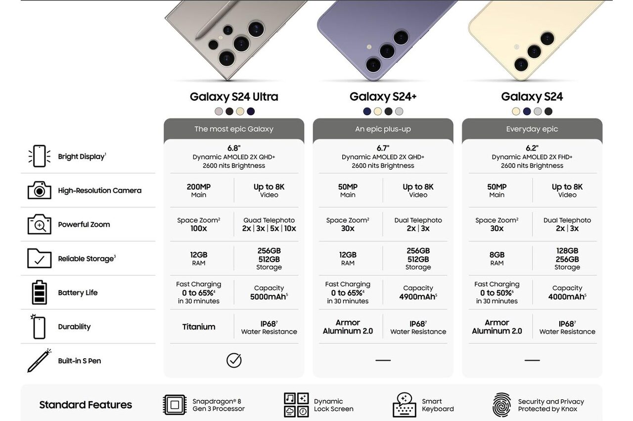 * 갤럭시S24: 6.2인치 다이내믹 아몰레드 디스플레이, 8GB 램, 트리플 카메라 시스템, 4천mAH 배터리