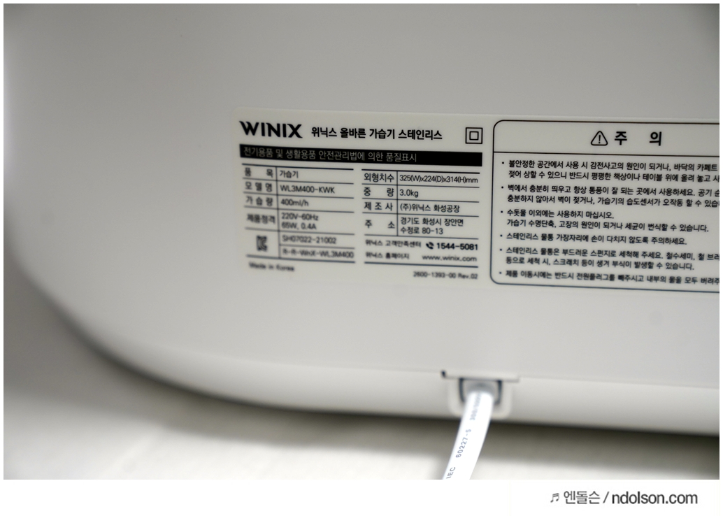 위닉스 가열식 가습기 WL3M400-KWK 모델이며,스테인리스 화이트 색상의 제품입니다.
