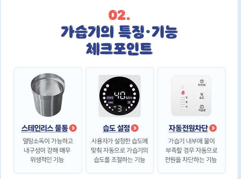 * 분무량 조절이 가능하여 원하는 습도로 조절할 수 있다.