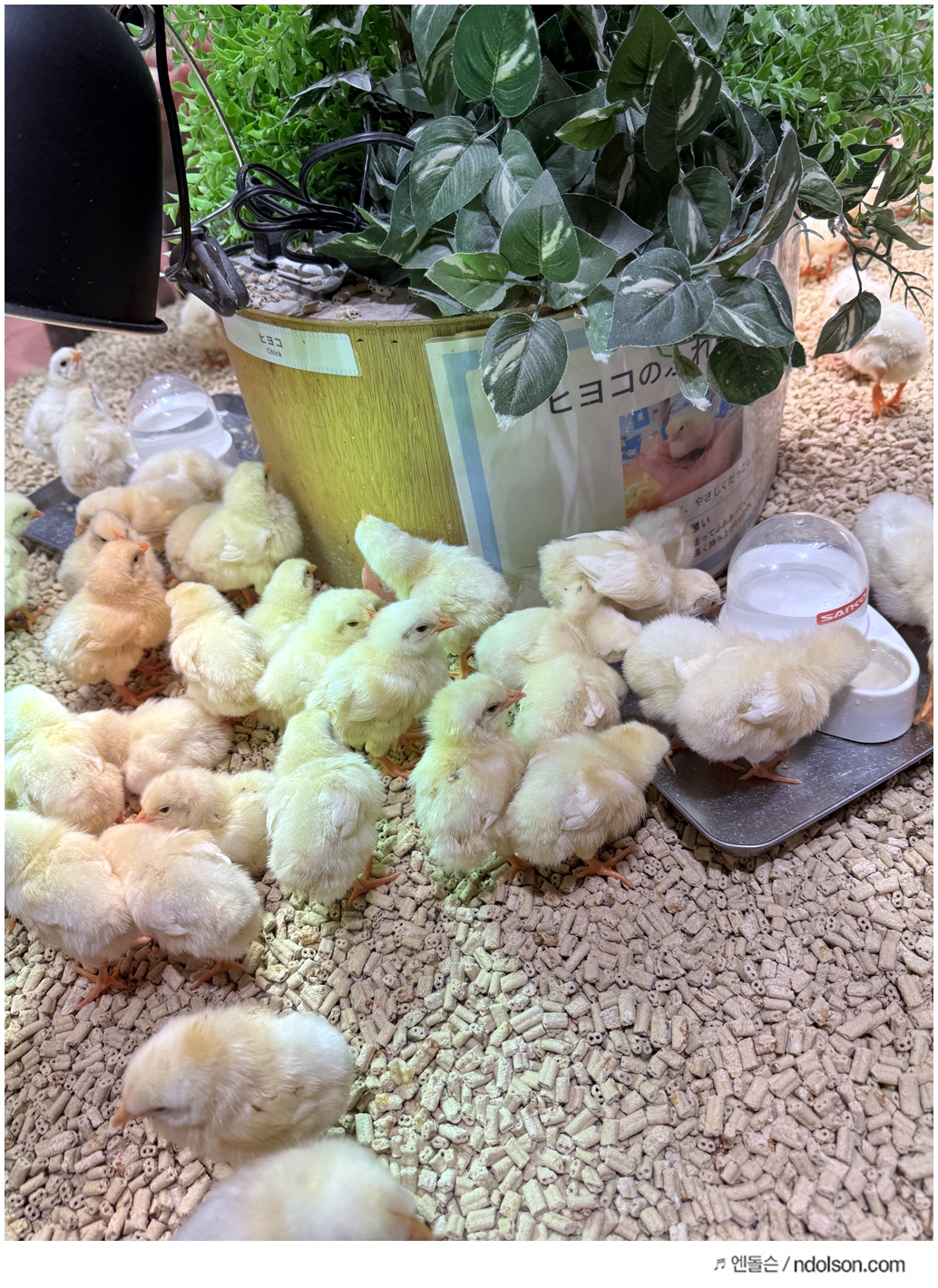 후쿠오카 모프 애니멀 카페(moff animal coffee)에 들어서자마자 보이는 병아리 체험 존은 정말 매력적이었습니다.