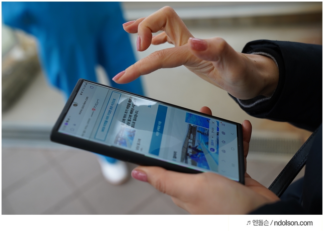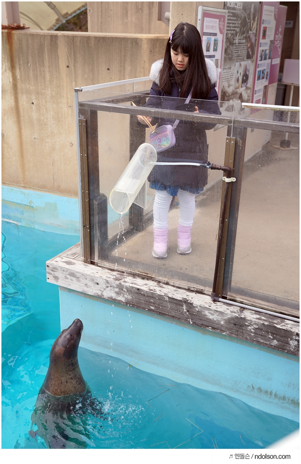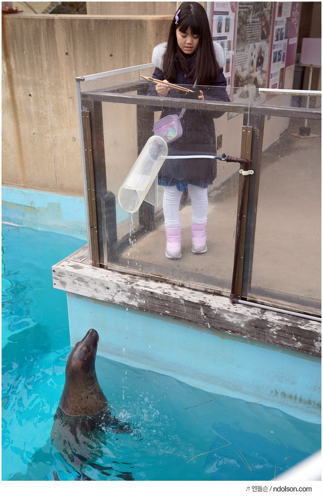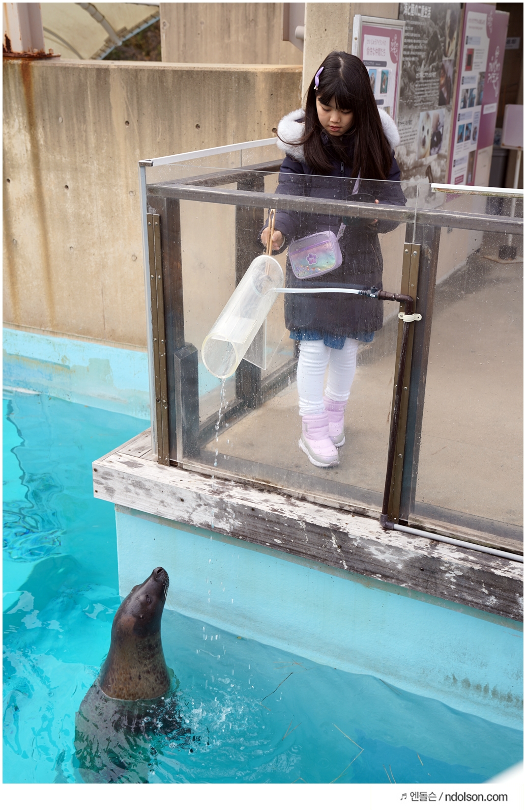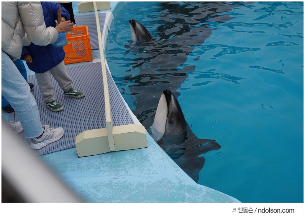 돌고래 먹이를 받고 줄 때, 사진은 촬영할 수 있는 사람은 같이 못 들어갑니다. 그래서 옆에서 촬영해야 해요.