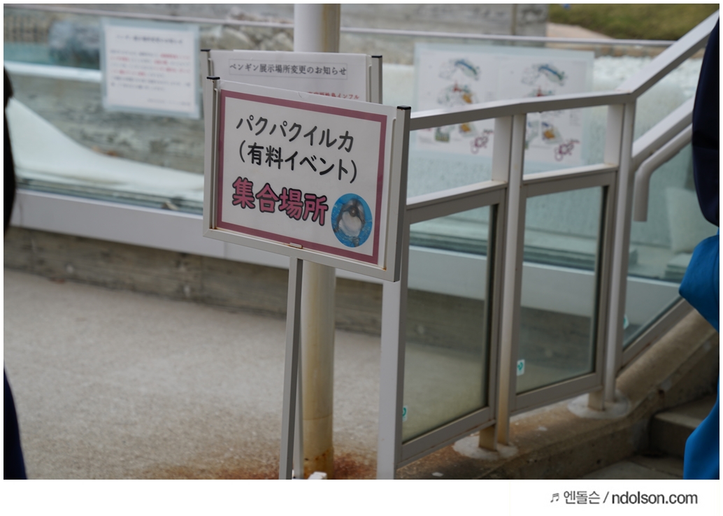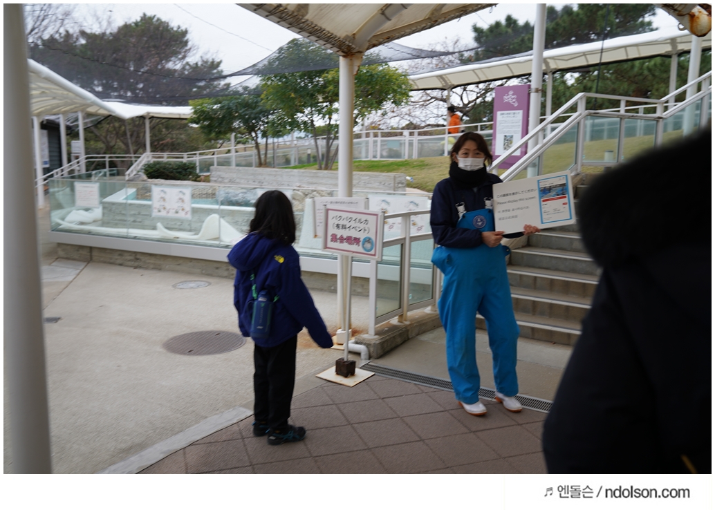 마린월드 우미노나카미치 수족관에 도착해서 돌고래 먹이주는 장소로 이동했습니다. 시간 맞추어서 가면 앞에서 안내원이 기다리고 있습니다.