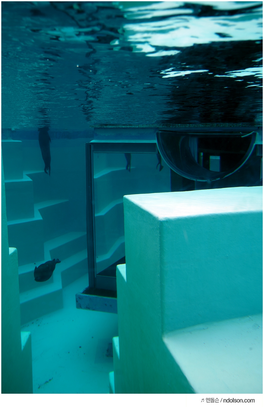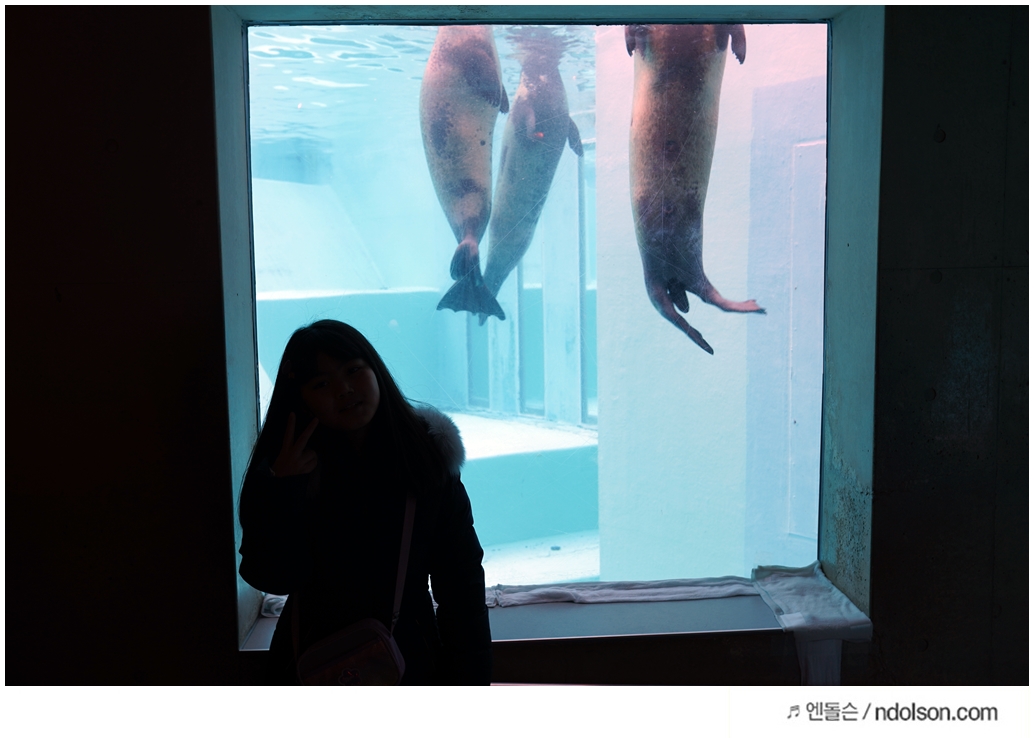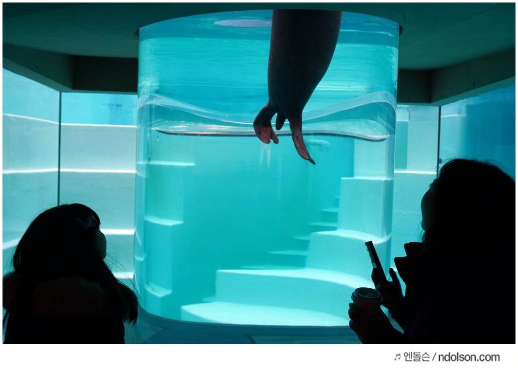 타이밍을 맞추어 찍으니 돌고래가 유리창으로 나올 때 찍을 수 있었어요.