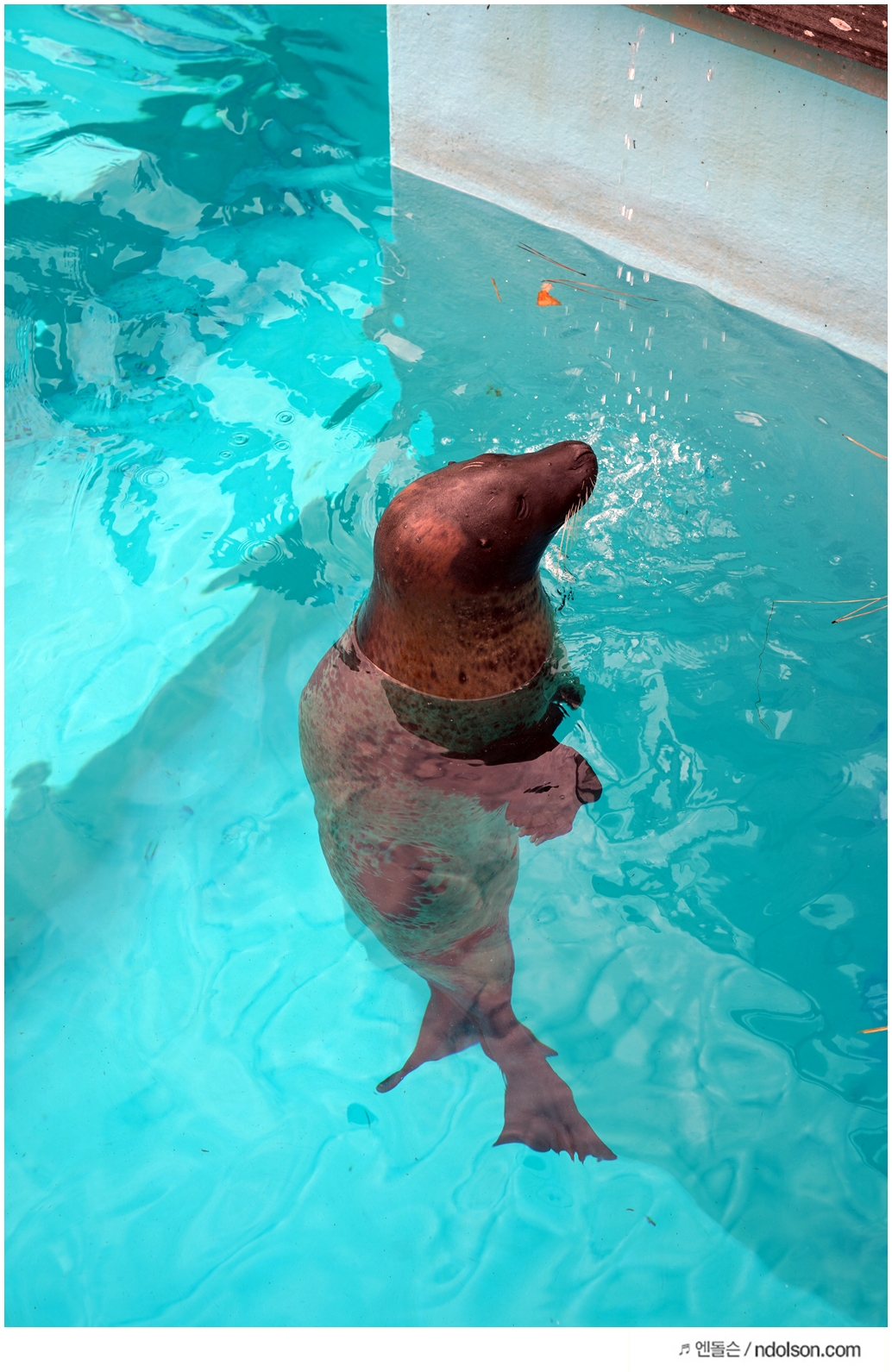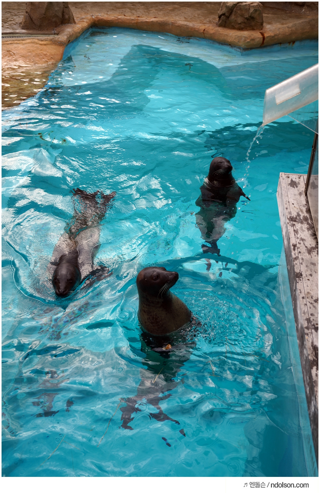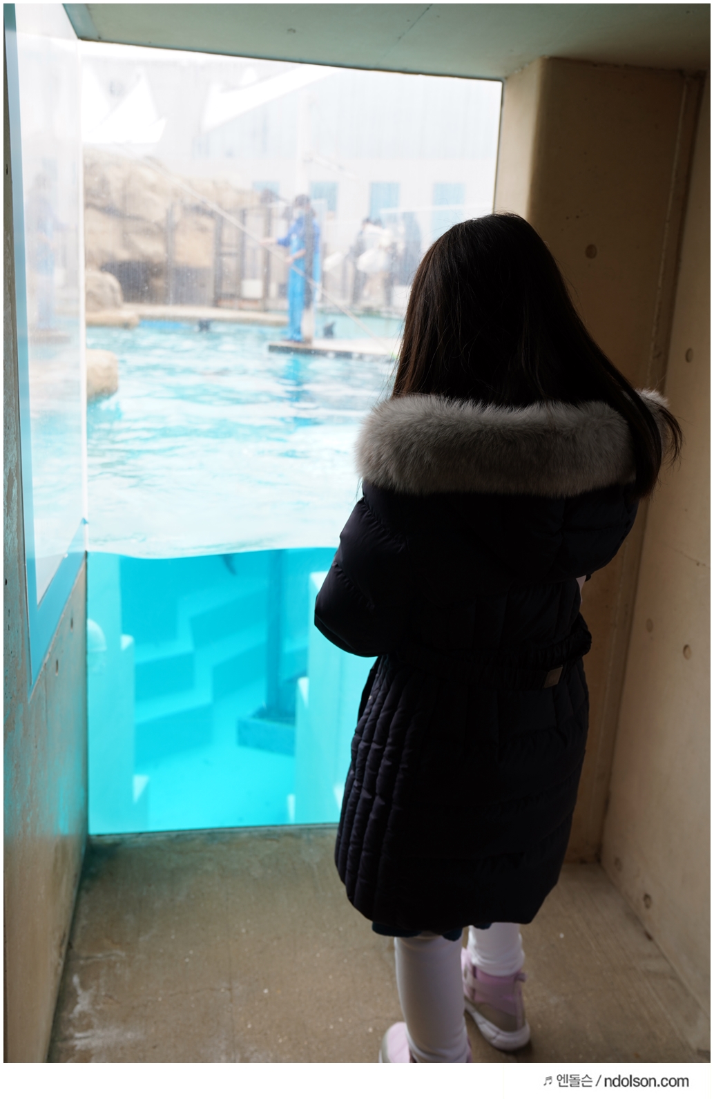 타이밍을 맞추어 찍으니 돌고래가 유리창으로 나올 때 찍을 수 있었어요.