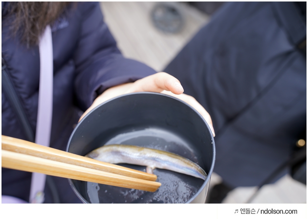 먹이는 400엔이고 통과 함께 생선이 들어 있습니다. 젓가락을 집어서 던져주면 먹네요.