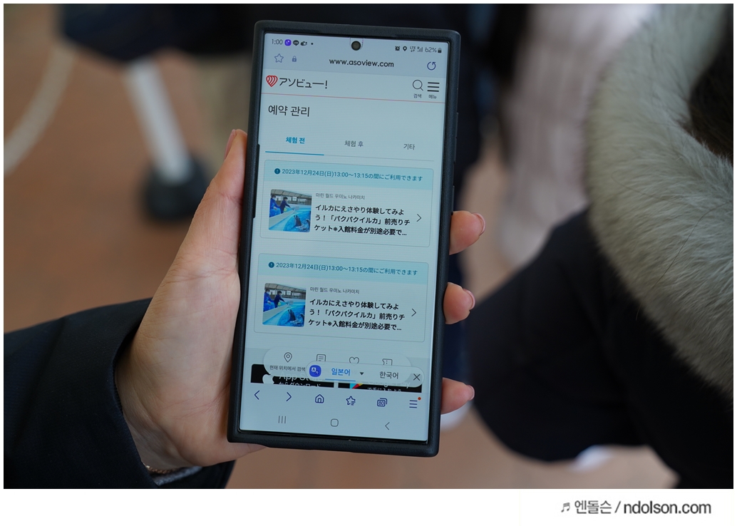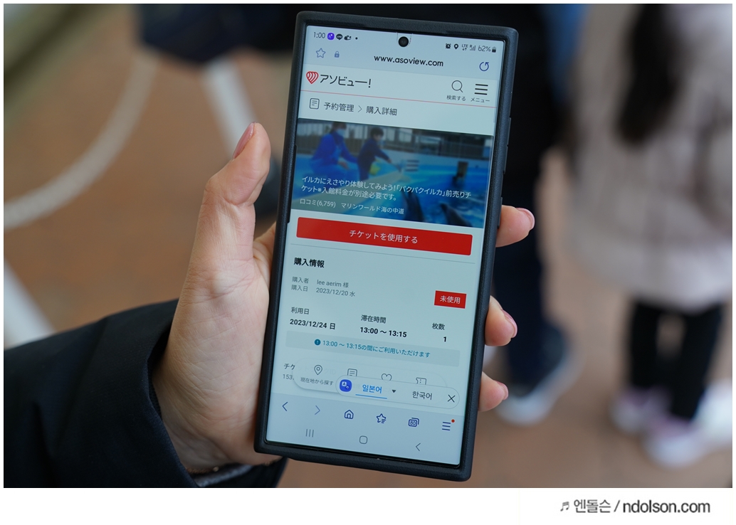 미리 마린월드 우미노나카미치 돌고래 먹이주기를 예약해 두었기 때문에 앱으로 보여주면 됩니다.