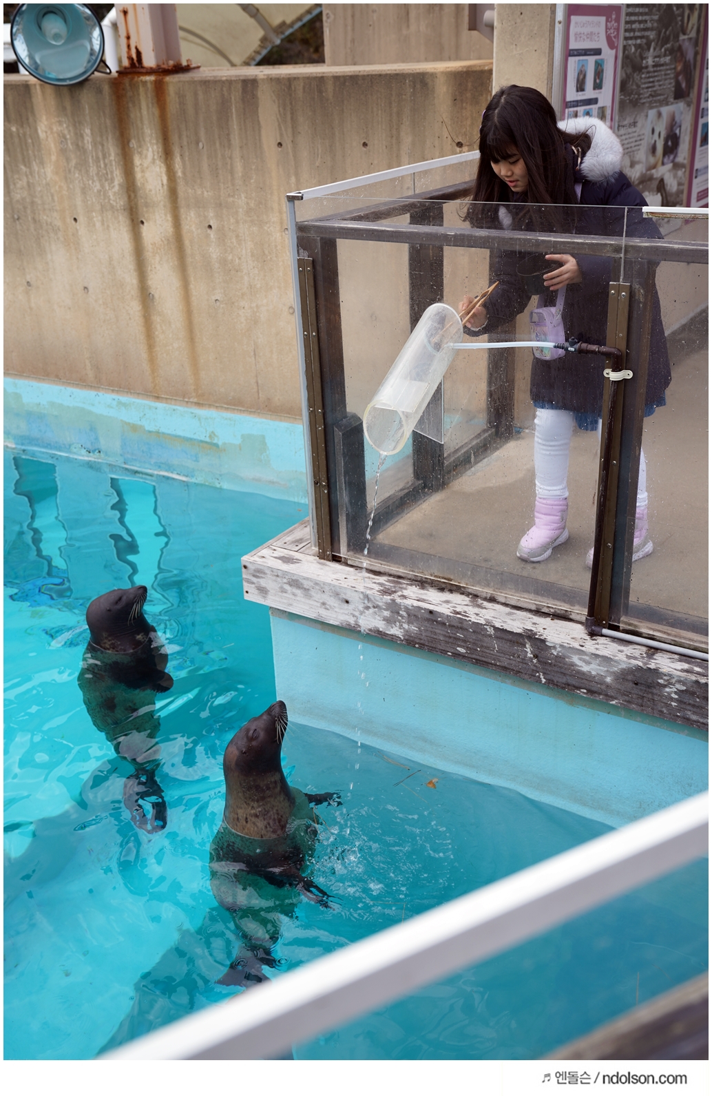 마린월드 우미노나카미치 수족관에 도착해서 돌고래 먹이주는 장소로 이동했습니다. 시간 맞추어서 가면 앞에서 안내원이 기다리고 있습니다.