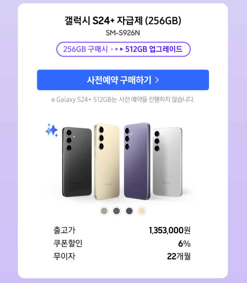 갤럭시 S24+ 플러스: 오닉스 블랙, 마블 그레이, 코발트 바이올렛, 앰버 옐로우 색상 (256GB - 135만3000원, 512GB - 149만6000원)