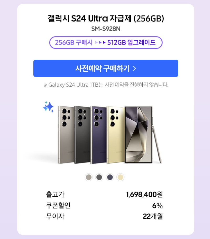 갤럭시 S24 울트라: 티타늄 블랙, 그레이, 바이올렛, 옐로우 색상 (256GB - 169만 8400원, 512GB - 184만 1400원, 1TB - 212만 7400원)