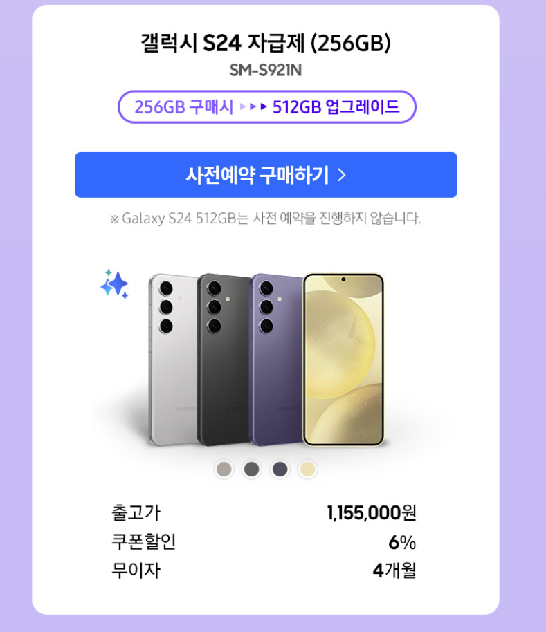 갤럭시 S24 자급제 256GB을 구매하면, 512GB로 업그레이드 해줍니다. 할인쿠폰 적용해서 1,269,900원에 갤럭시 S24 최신 스마트폰을 구매할 수 있습니다.