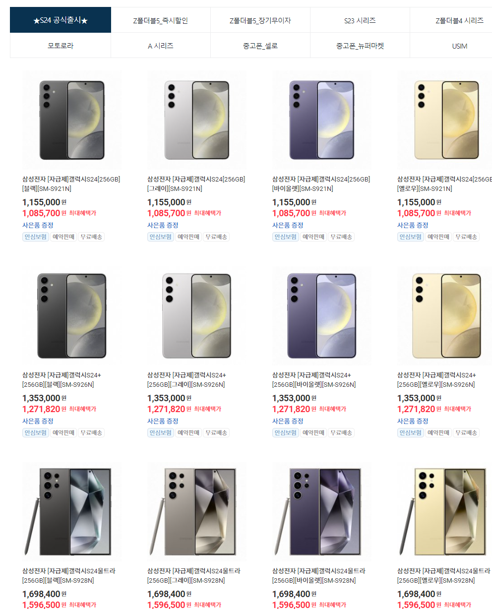 - 갤럭시 S24 모델(256GB): 115만5천원