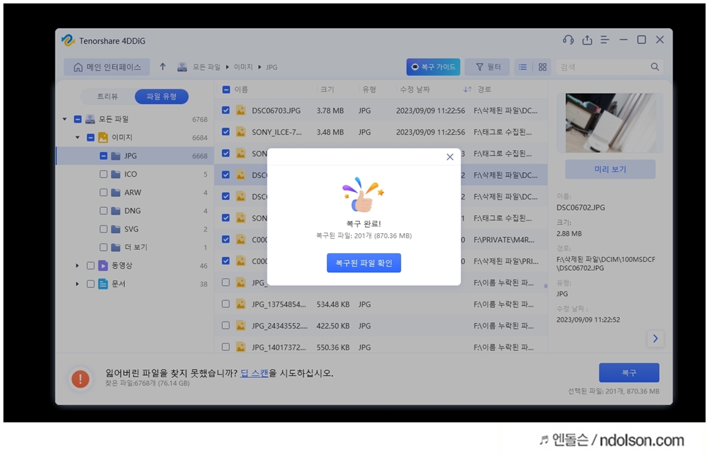 그래서 클릭만으로 빠른 스캔으로 쉽게 복구되고, 찾지 못한 파일은 딥스캔으로 검색하여 복구할 수 있습니다. 손상된 파일도 복구해서 보여주네요.