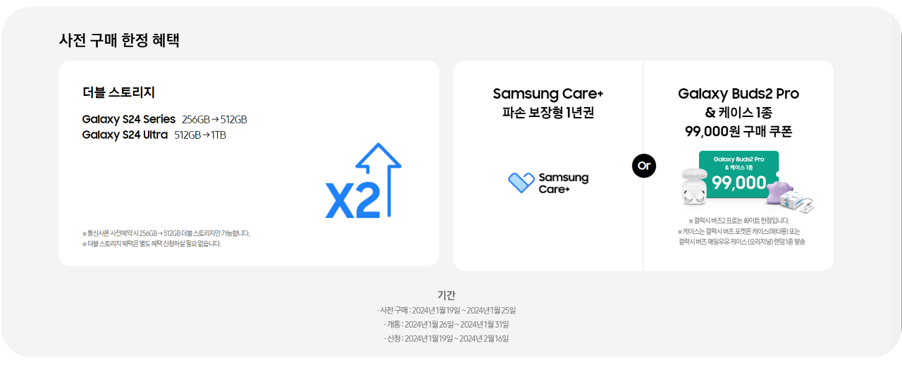 - 대상 : 예약 기간 내 Galaxy S24 시리즈를 사전예약 및 사은품 신청 후 예약자 개통 기간 내 구매‧개통하신 고객