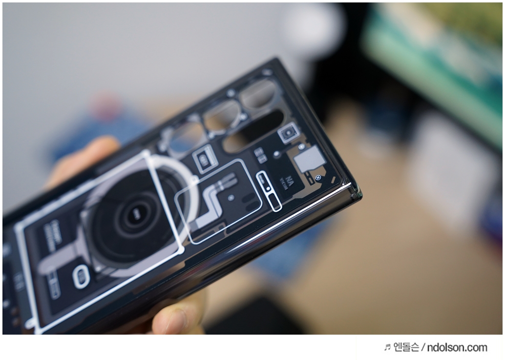 회로판 같은 디자인이 독특하며, 버튼 눌림 감도 매우 만족스럽습니다. 이 케이스 역시 맥세이프 보조배터리를 부착했을 때 S펜 작동에 문제가 없었습니다.