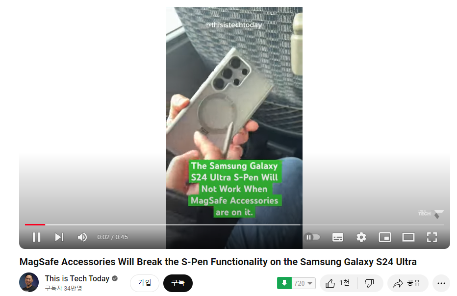 유튜버에서 언급한 갤럭시 S24 울트라에 맥세이프케이스를 씌우면, S펜 간섭 이슈가 발생한다고 합니다.