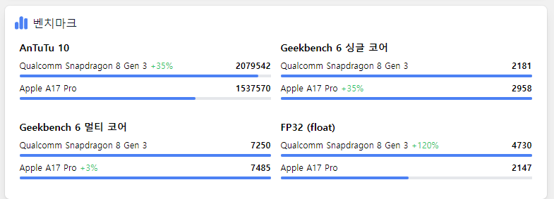 아이폰 15 프로와 갤럭시 S24 울트라에 탑재되는 두 프로세서(A17 Pro, Snapdragon 8 Gen 3)는 가장 최신 AP입니다.