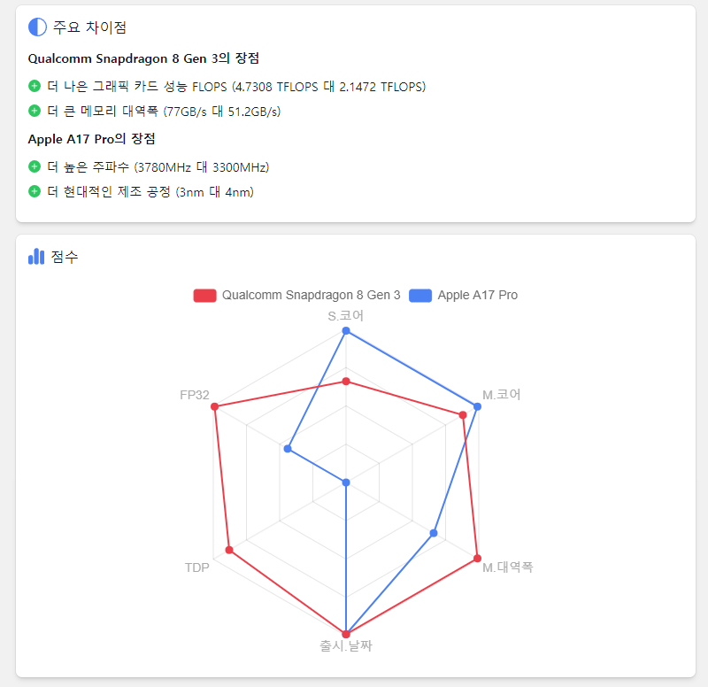 결국 Snapdragon 8 Gen 3은 전반적인 성능과 멀티태스킹에서 우위를 보이는 반면, A17 Pro는 게이밍 성능과 배터리 효율성에서 강점을 가지고 있습니다. 하지만 사용자의 용도와 선호에 따라 적합한 선택이 달라지겠죠.