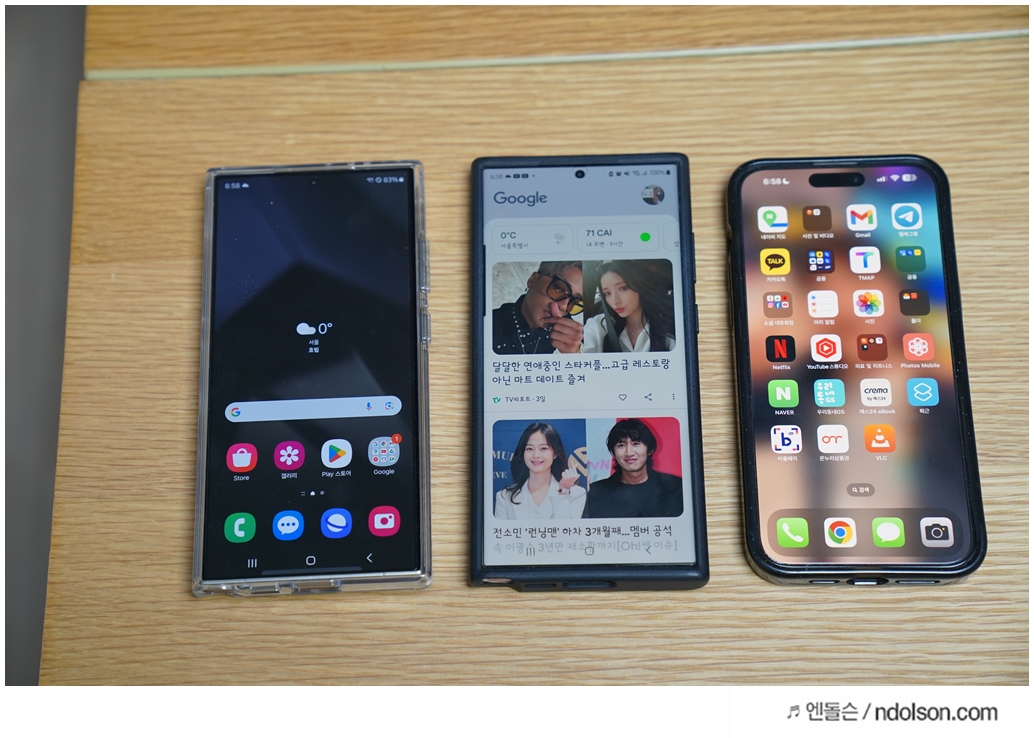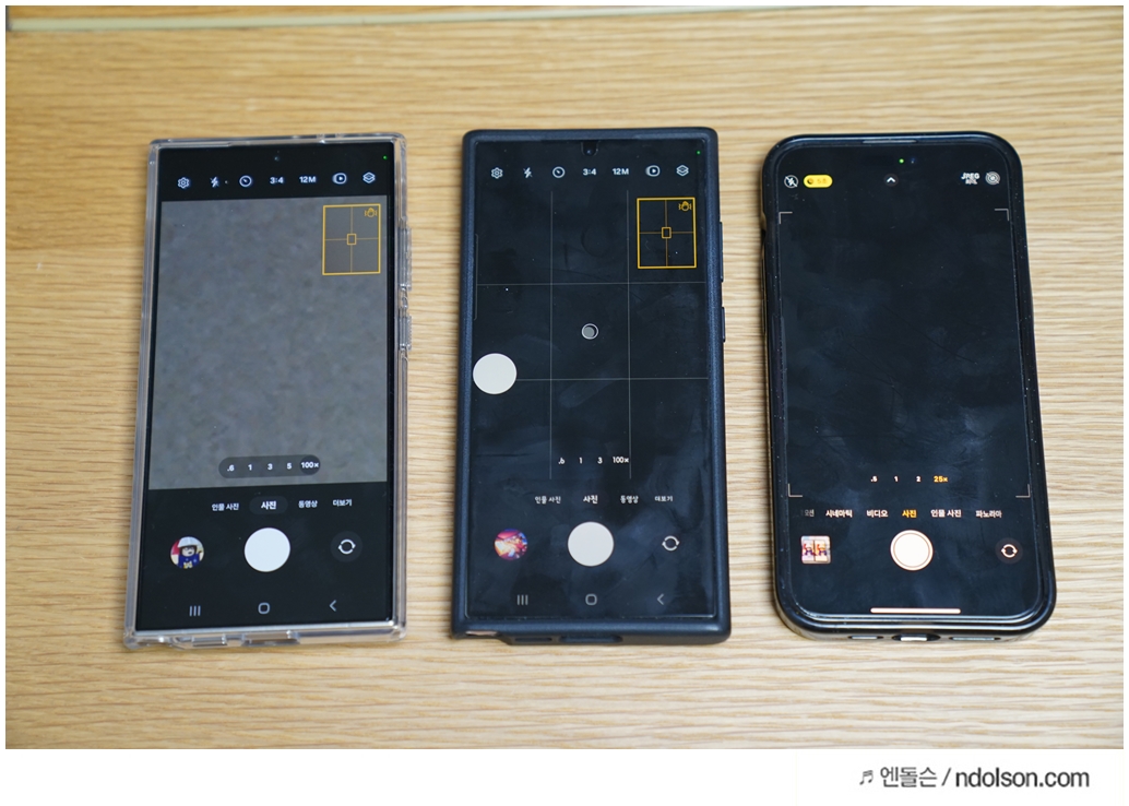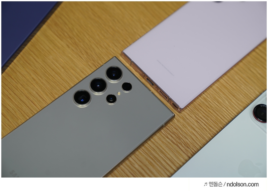 왼쪽부터 갤럭시 S24 울트라 모델이고, 갤럭시 S23U, 아이폰 15 프로맥스입니다.