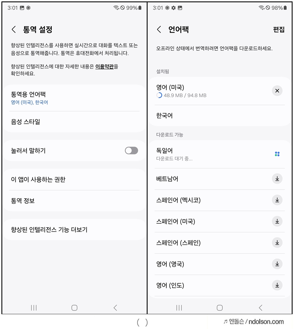 또 번역이나 실시간 전화 통화 통역은 언어팩을 미리 다운로드 받아 두어야 합니다.