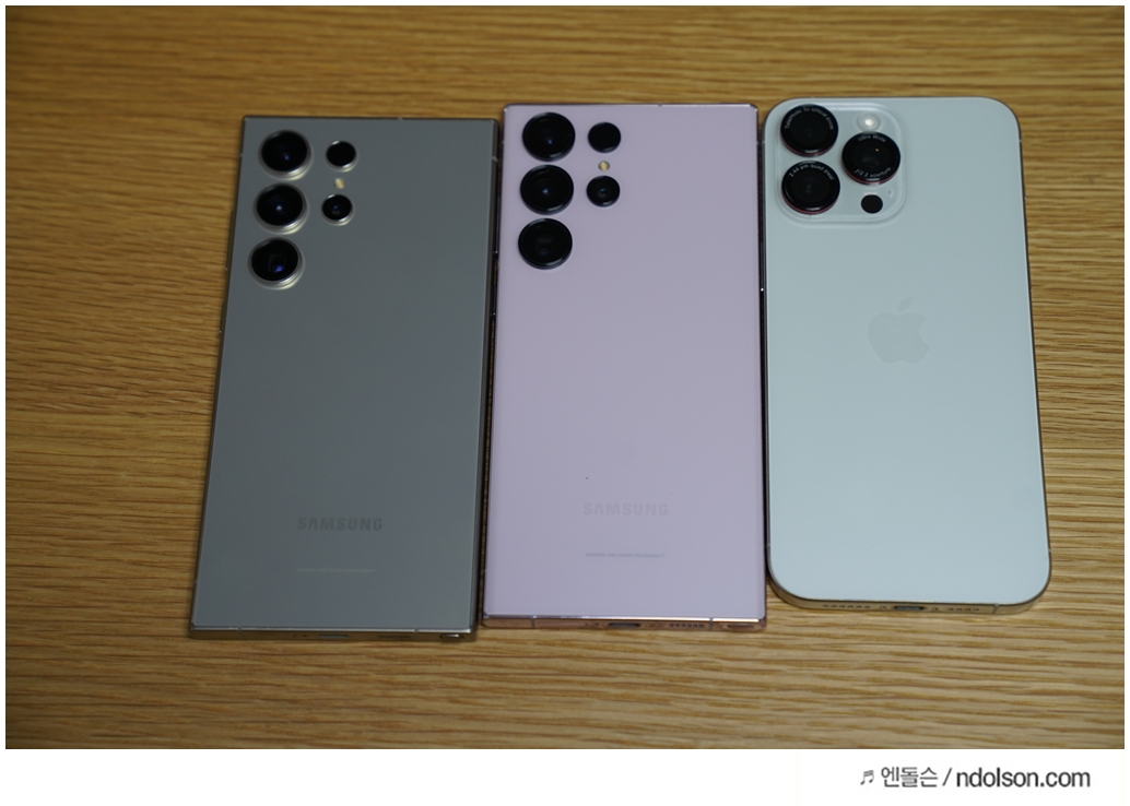 왼쪽부터 갤럭시 S24 울트라 모델이고, 갤럭시 S23U, 아이폰 15 프로맥스입니다.