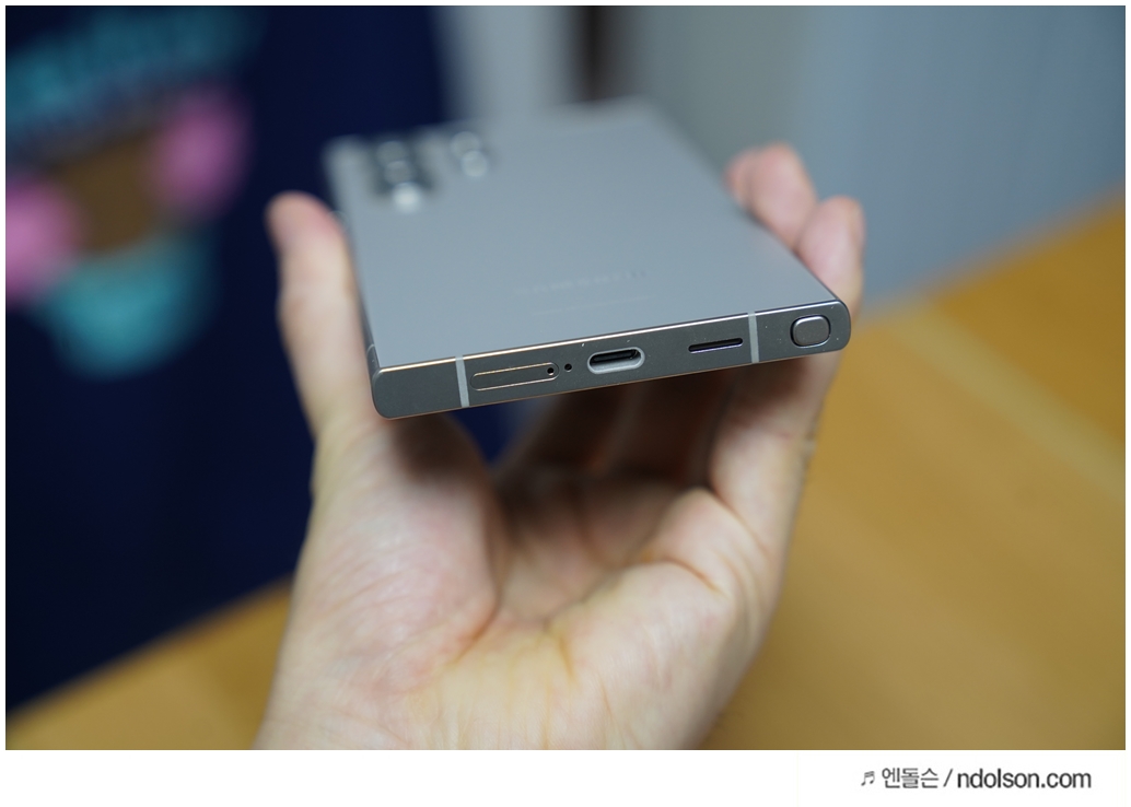 갤럭시 S24 울트라는 크고 무거운 외관에 새로운 티타늄 프레임을 도입하며 견고함을 한층 강화했습니다. 실제로 만져보면 폰이 단단한 느낌을 줍니다.