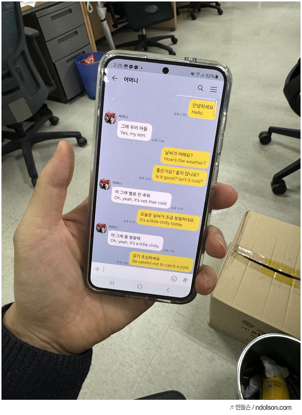 문자도 주고받을 때 실시간으로 번역을 해줍니다. 원하는 언어팩만 설치하면 자동으로 됩니다.