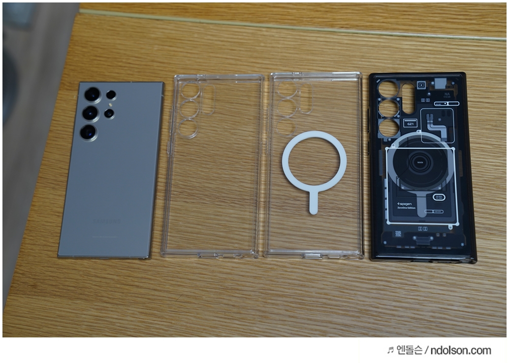 필자도 갤럭시 S24 울트라를 위한 슈피겐의 1mm 초슬림 투명 에어스킨 하이브리드 케이스와 다양한 맥세이프 케이스, 또 투명 케이스를 사용해보고 추천해드리려고 합니다.