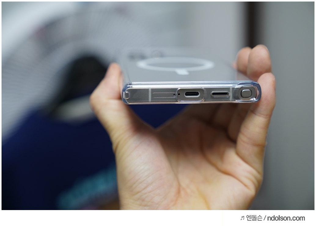 갤럭시 S24는 투명케이스의 하단 부분이 열려 있습니다. 충전단자부가 케이블이 두꺼우면 못 들어가는데, 넓게 고려되어 있어 쓰면서 불편한 점은 없었습니다.