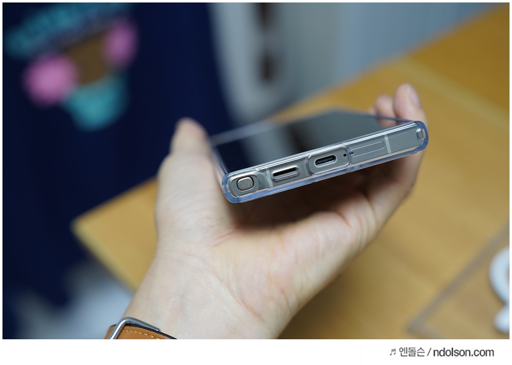 갤럭시 S24는 투명케이스의 하단 부분이 열려 있습니다. 충전단자부가 케이블이 두꺼우면 못 들어가는데, 넓게 고려되어 있어 쓰면서 불편한 점은 없었습니다.