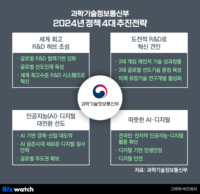 과학기술정보통신부는 2024년 주요 정책 추진계획을 발표하며, 디지털 혁신 및 국가 연구개발(R&D) 제도 개선에 중점을 두었습니다.