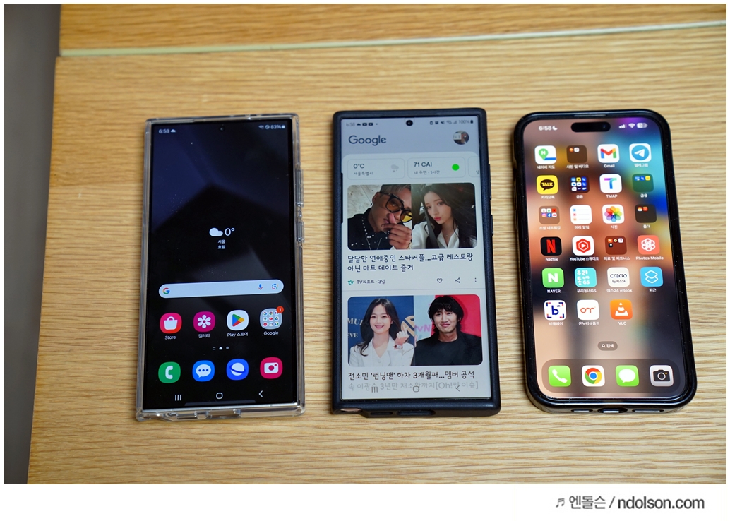 아이폰15프로맥스, 갤럭시S23울트라, 갤럭시S24U 까지 나란히 두었습니다. 개인적으로 화면 크기는 아이폰15프로맥스가 6.7인치로 1인치가 갤럭시S24 울트라의 6.8인치보다 작습니다.