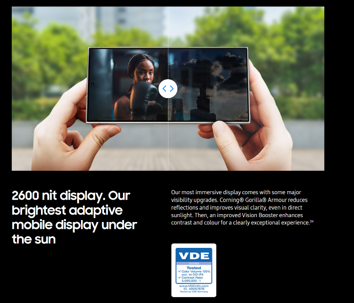 1440p의 해상도와 19:3:9의 화면 비율을 제공합니다. 최대 2600니트의 밝기로 아이폰보다 우수한 야외 가독성을 자랑합니다. 플랫 디자인의 스크린과 적은 반사로 인해 야외에서의 사용 경험이 탁월합니다.