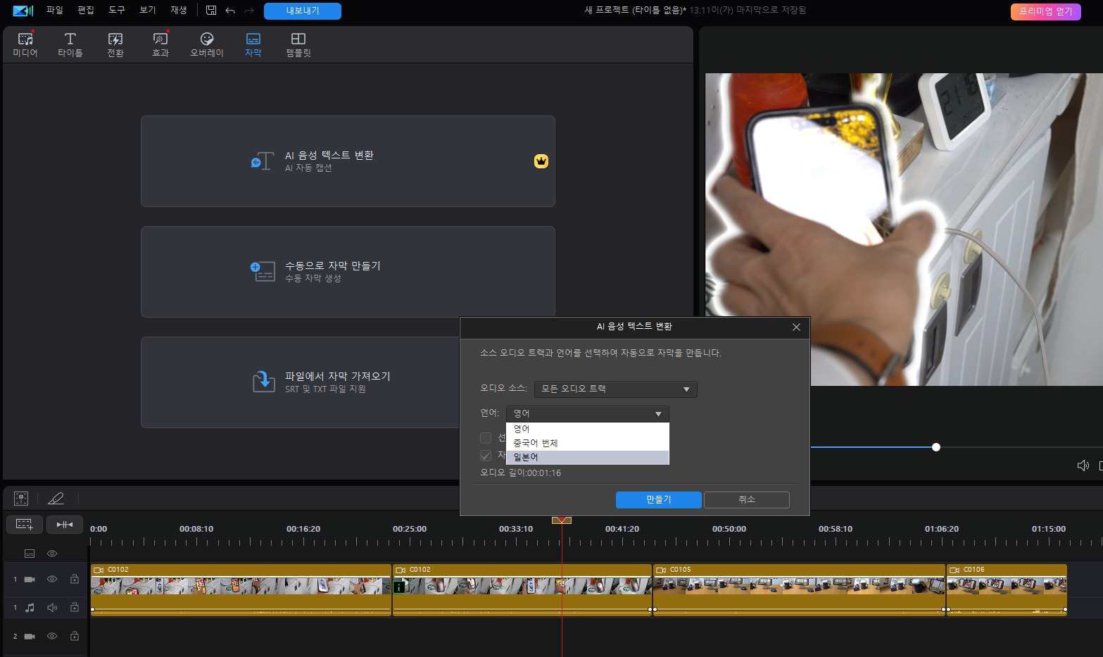 하지만, 자막 부분은 미흡하게 느껴집니다. 인공지능이 자동으로 변환하지만, 한국어가 지원하지 않고 영어, 중국어, 일본어만 지원됩니다.
