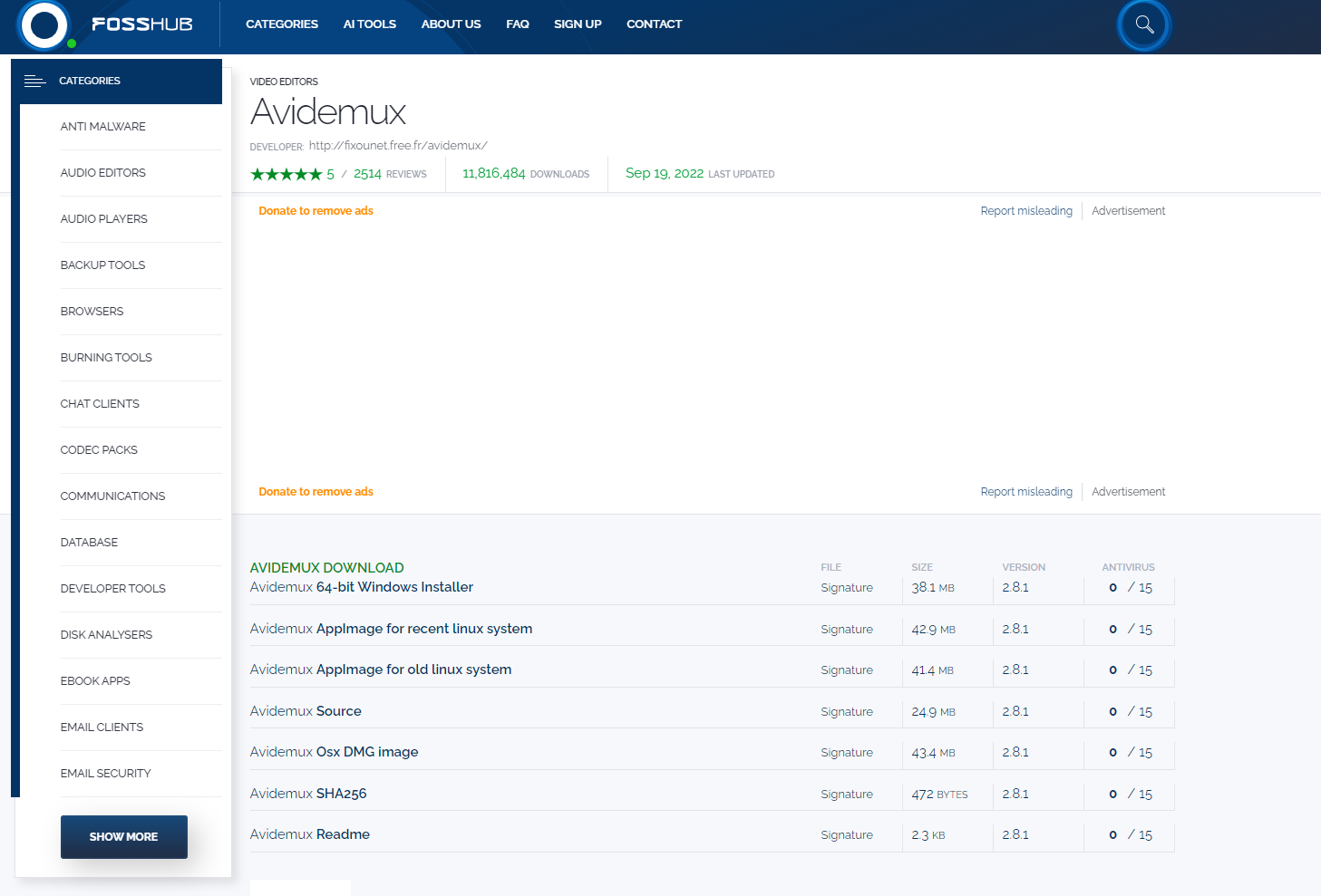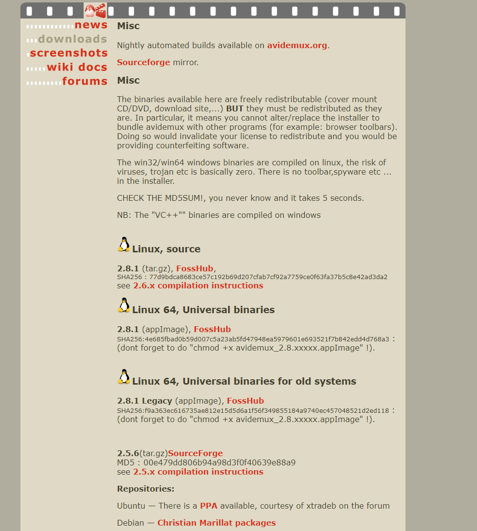 간단한 커팅, 필터링, 인코딩 작업에 적합한 Avidemux는 무료이면서도 강력한 기능을 제공합니다. 그렇지만 설치할 때 조금 복잡한 느낌이 듭니다. 개발자라서 그런지 개발자 소스별로 찾아서 가는 느낌이 듭니다. 리눅스 및 윈도우용을 지원하지만, 다운로드가 다소 번거로웠습니다.