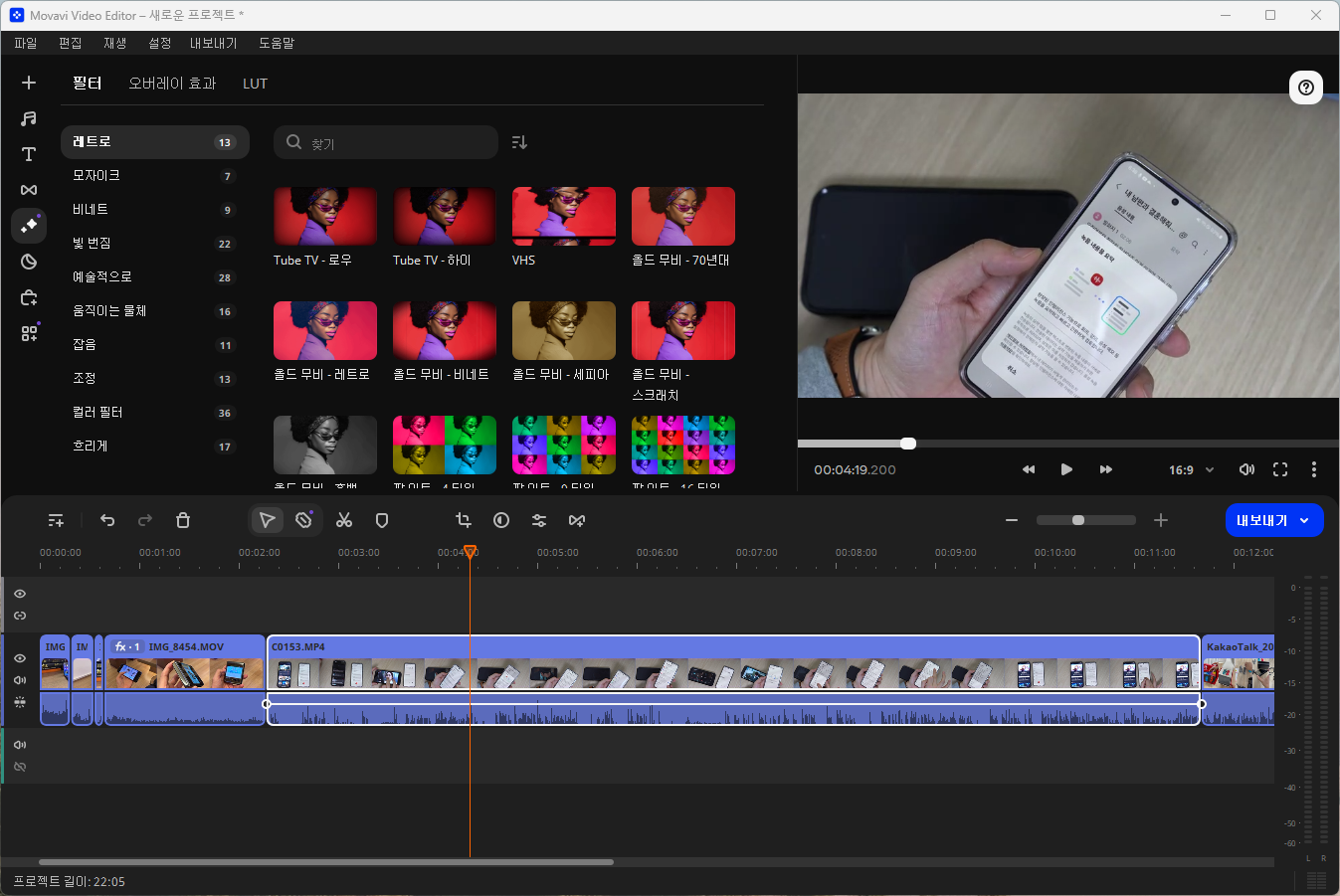 동영상을 원본 그대로 사용해도 되지만, 주제에 맞게 필처링을 써서 영상 필터를 적용하면 분위기가 달라지니 좋습니다.