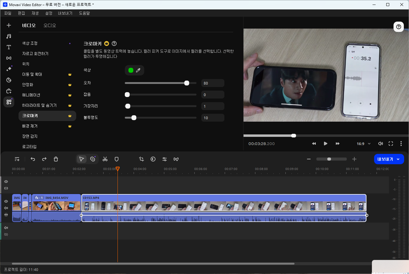 동영상 고급기술처럼 보이는 크로마키 효과로 AI인공지능 툴이 알아서 해줍니다.원하는 부분의 색상만 찍어주면, 요즘은 스마트하게 바로 크로마키가 적용됩니다.