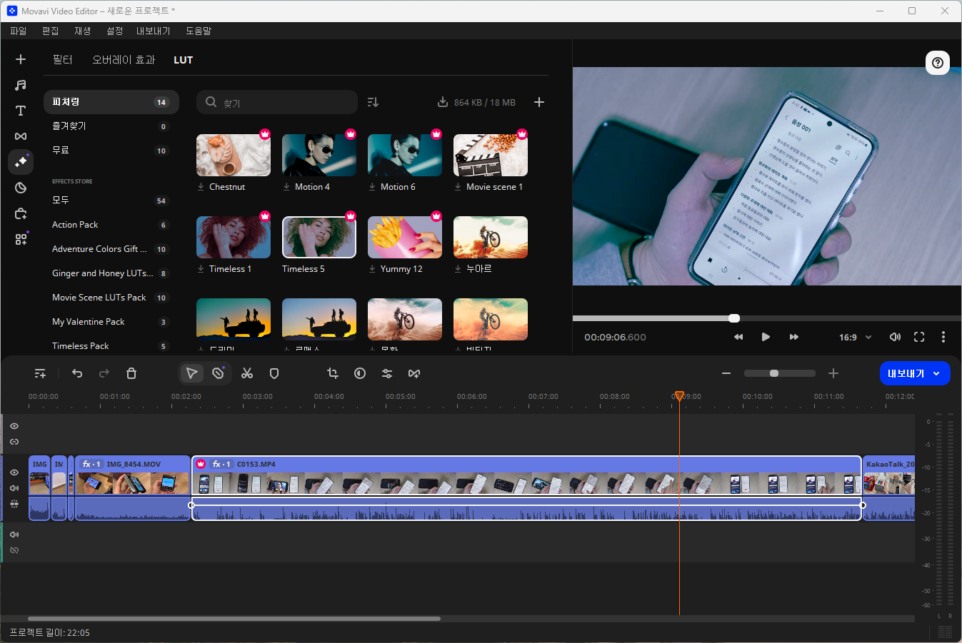 AI 배경 제거, 소음 제거, 다양한 효과 및 필터, 안정화 옵션, LUT 적용, 색상 조정 등의 기능을 제공합니다. Movavi는 윈도우와 맥 모두 지원합니다. 유료 버전은 거의 모든 기능과 다양한 필터링이 무제한으로 사용할 수 있습니다.