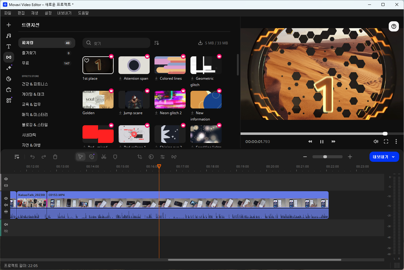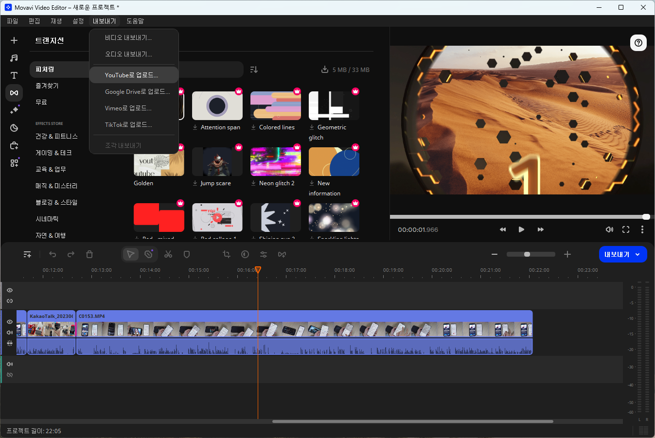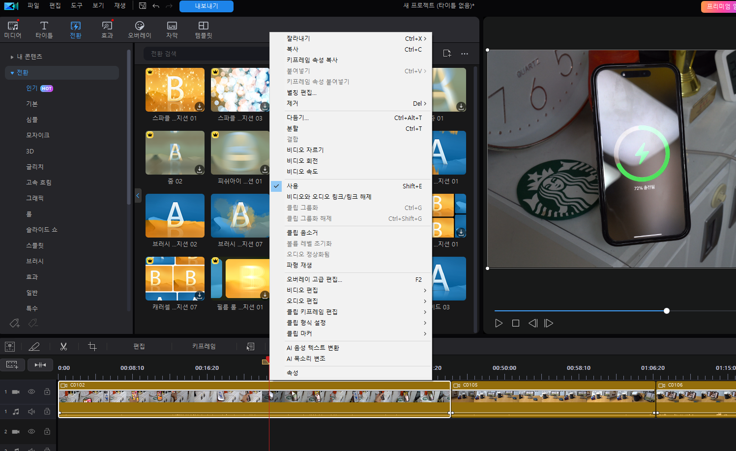 다양한 효과 중에서 영상의 인트로나 영상 간의 연결해 주는 트랜지션도 지원합니다. 영상이 지루하지 않게 해주는 다양한 효과가 무료로 제공되는데, 요즘 트렌드에 맞게 세련되어 매우 쓸만했습니다.
