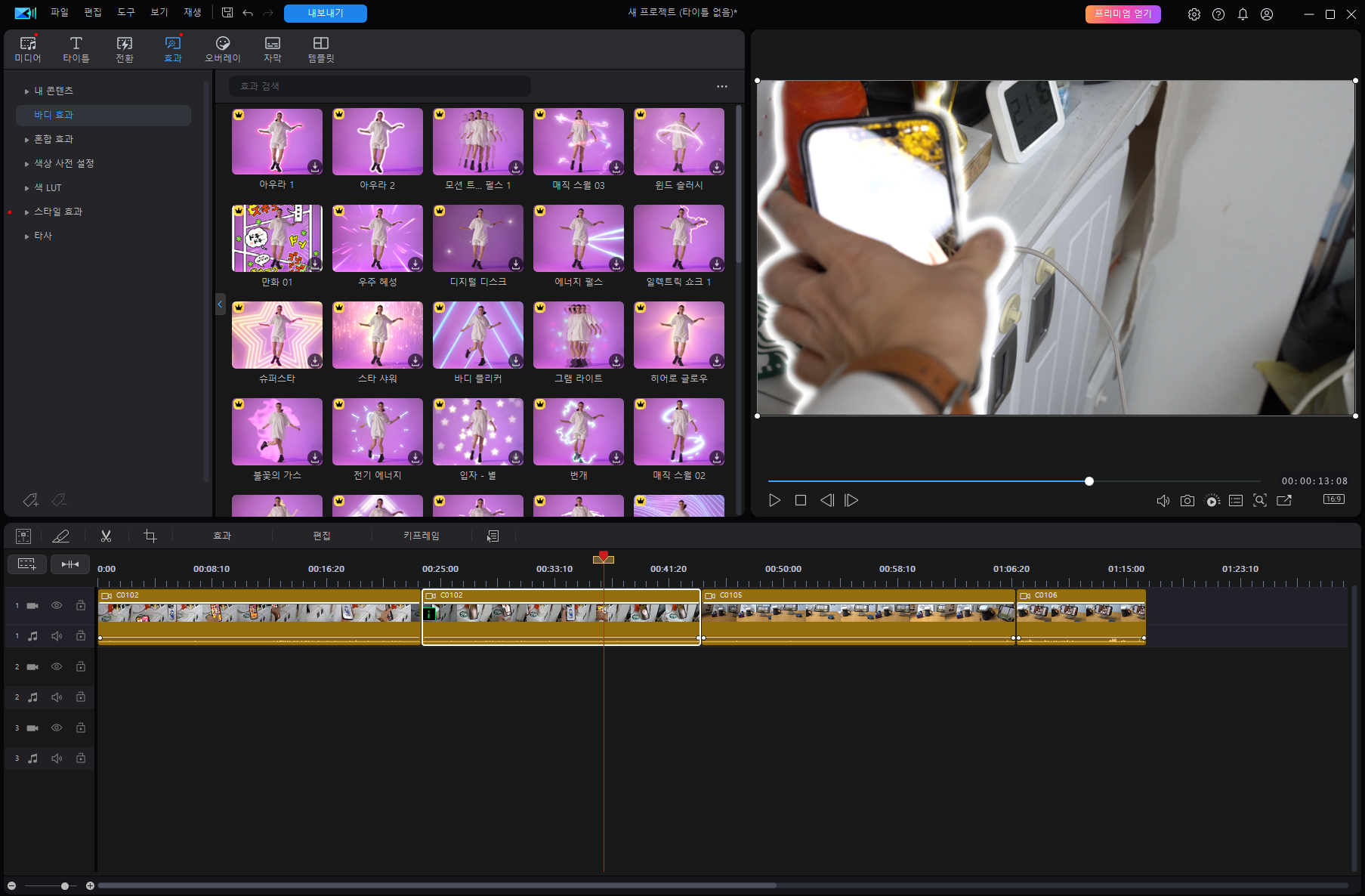 비디오 효과 적용도 간단하게 클릭만으로 적용이 됩니다. 간편하지만, 고급효과는 모두 유료 기능들입니다.