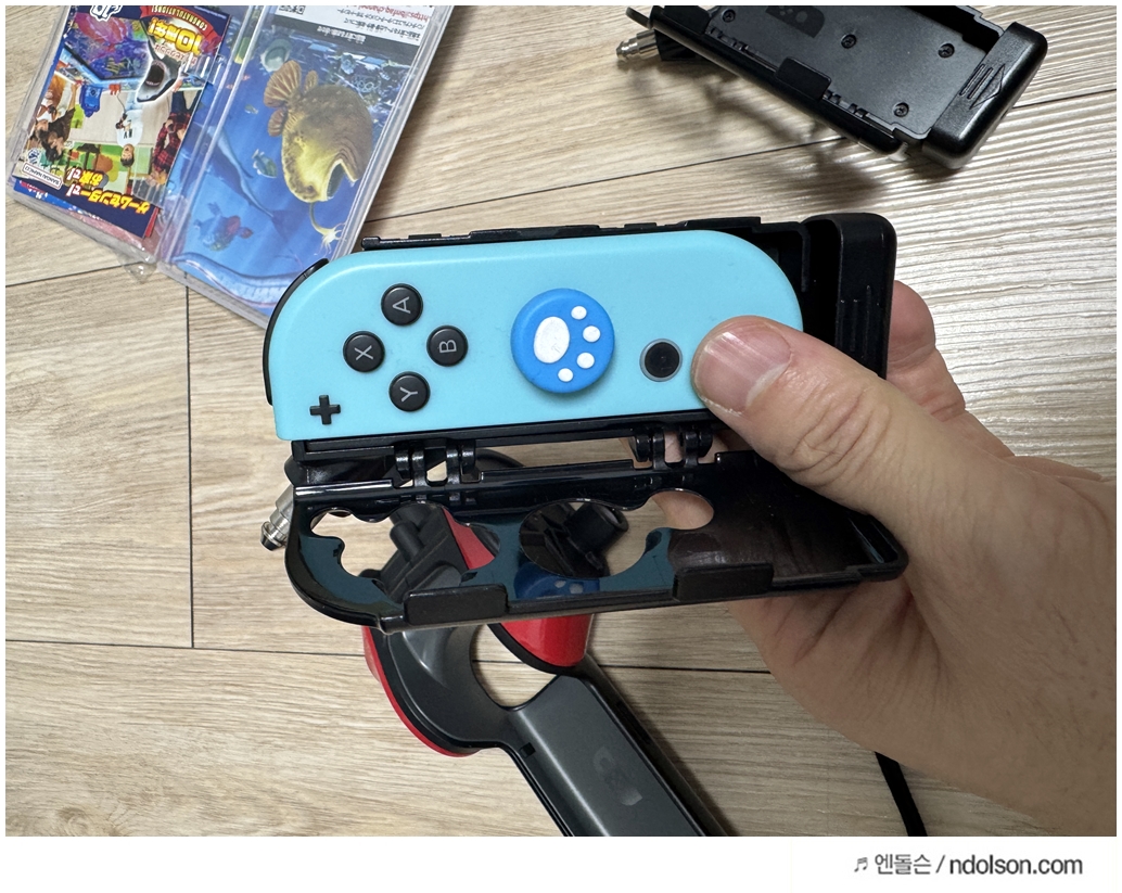 낚시 조이콘은 닌텐도스위치 조이콘이 잘빠지지 않게 고정되어 있습니다. 이렇게 끼워서 쓰면 되는데요.