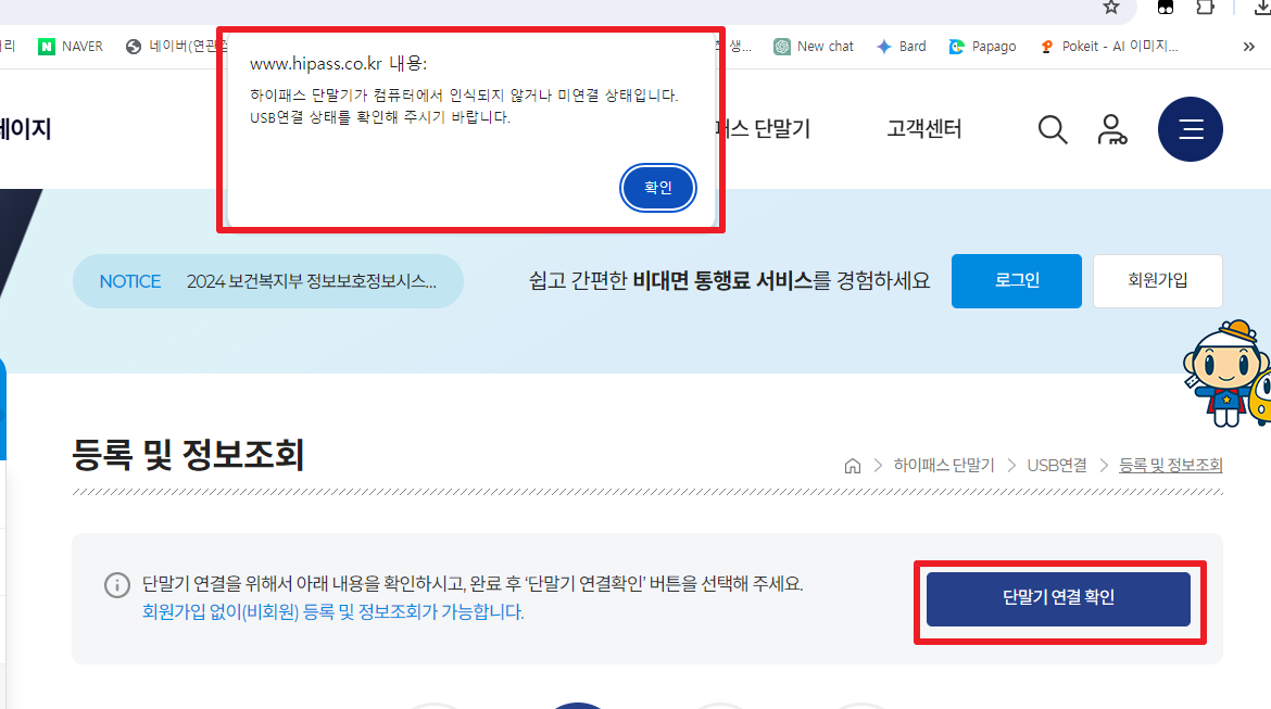 "하이패스 단말기가 컴퓨터에서 인식되지 않거나 미연결 상태입니다. USB연결 상태를 확인해 주시기 바랍니다."