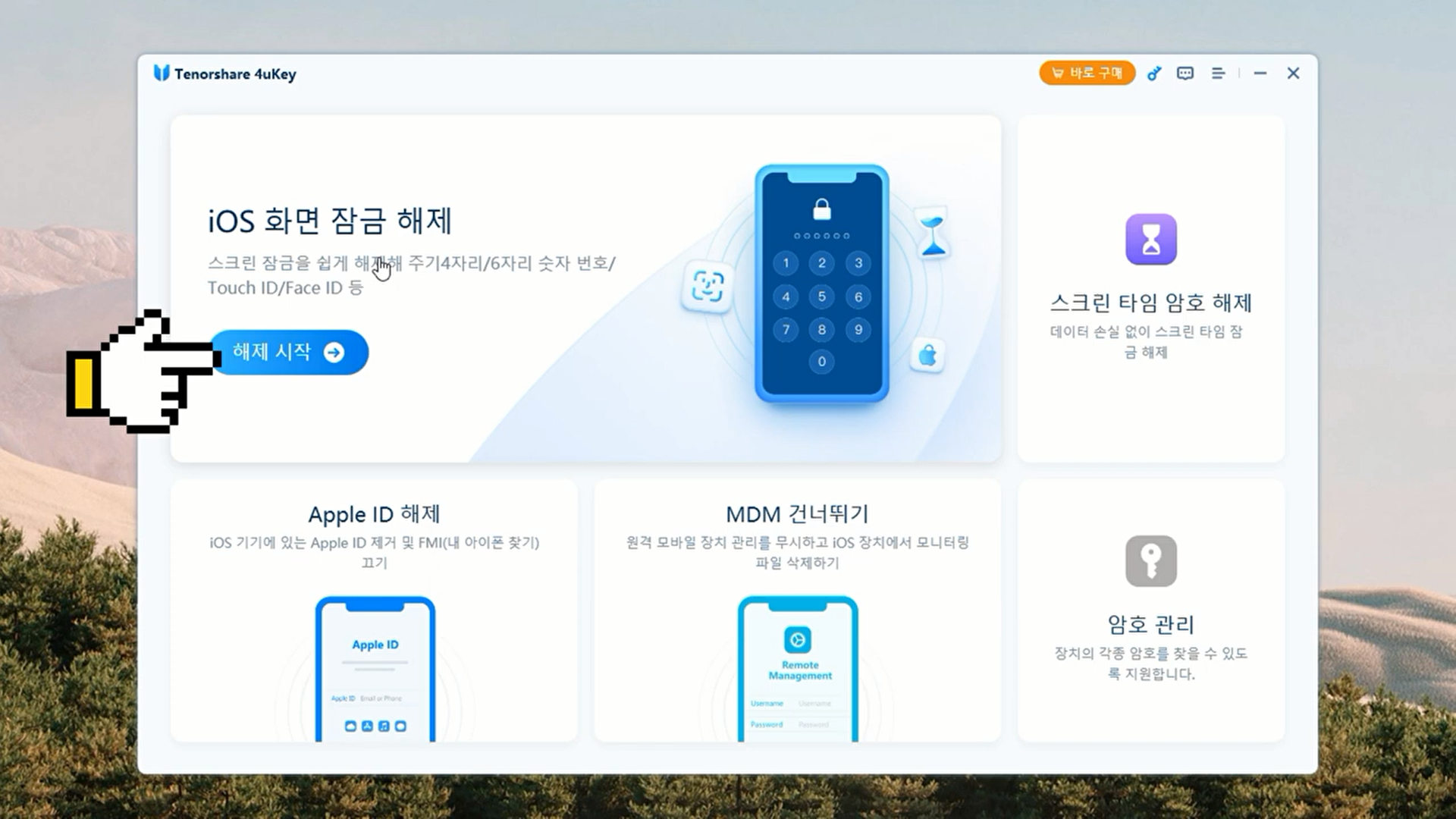 Tenorshare 4uKey (테너쉐어 포유키)의 iOS 화면 잠금 해제를 눌러 아이폰 패스워드 해제를 진행합니다.
