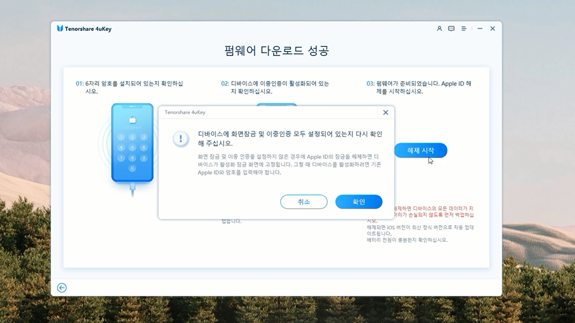 안내처럼 설정에서 이중 인증 및 숫자비밀번호를 설정했는지 물어봅니다. 이미 그렇게 설정했으니 확인을 눌러줍니다.