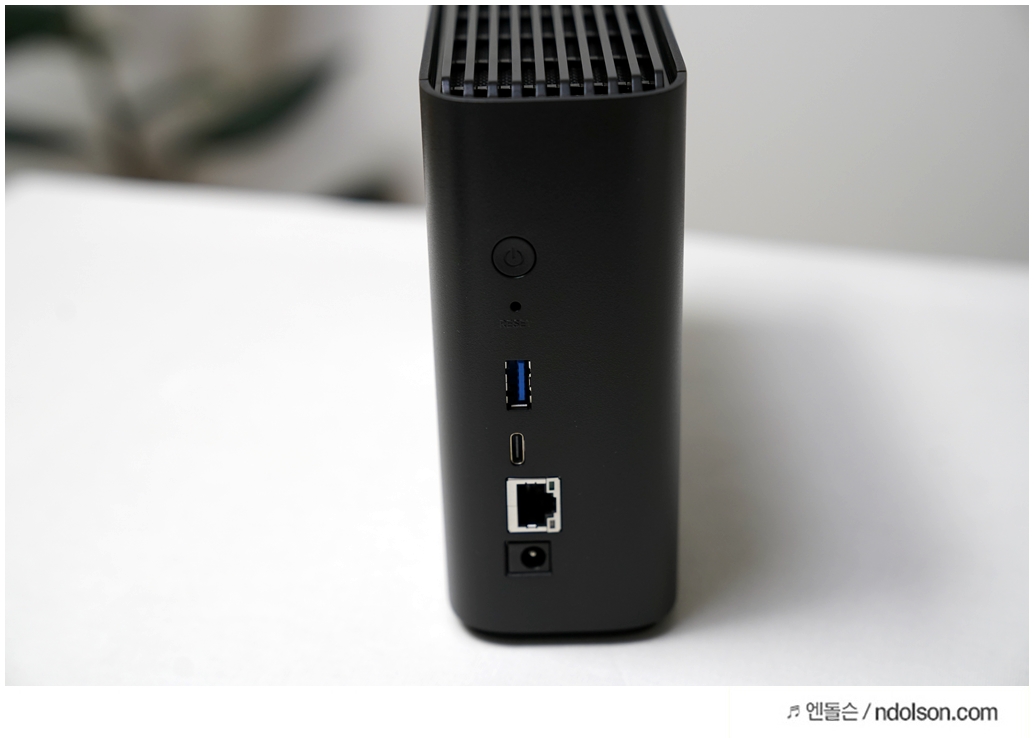 시놀로지 비스테이션의 인터페이스입니다. 뒷면에는 전원, USB-A·USB-C(USB 3.2 Gen.1, 5Gbps) 단, 입출력 단자는 1Gbps 이더넷 랜 포트, 전원으로 구성되어 있습니다.