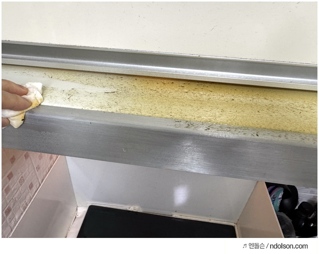 그리고 환기구 판의 기름때를 문질러 주었는데요. 기름때국물이 장난 아니게 나오네요.