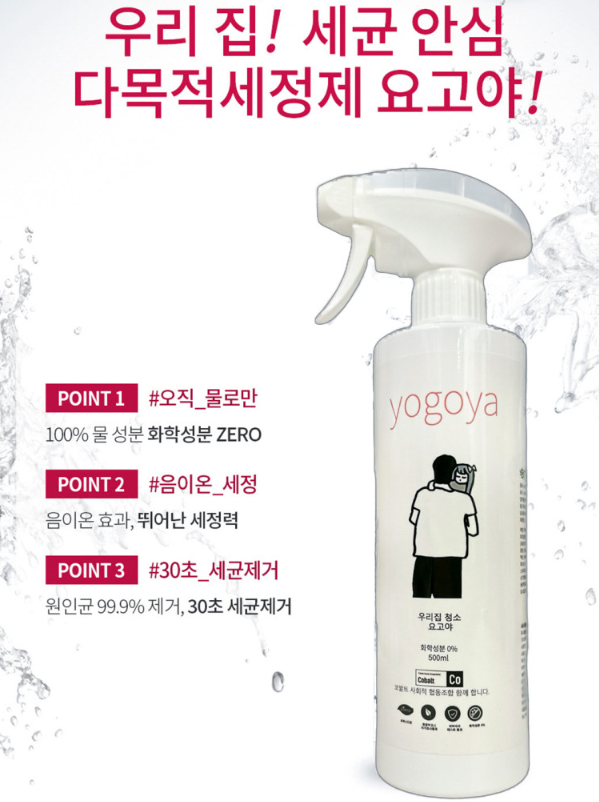 요즘 가정에서 사용하는 청소용품 중에는 다양한 화학 성분이 포함되어 있어 사용에 주의를 요하게 됩니다. 그러나 요고야 다목적 클리너는 100% 알칼리수를 사용하여, 세정 및 살균 기능을 자랑하며, 화학 성분에 대한 걱정 없이 사용할 수 있는 제품입니다