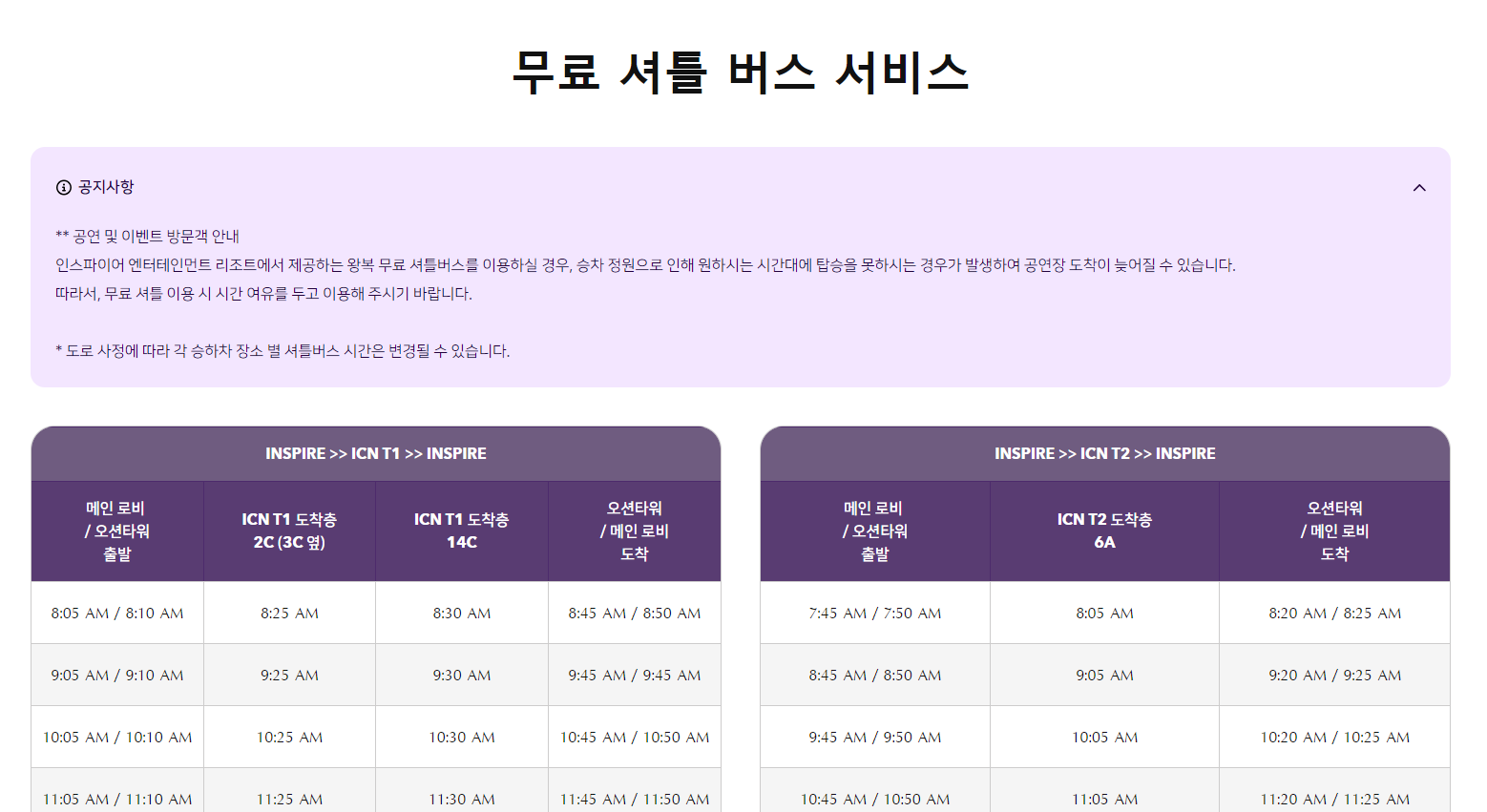 - 서울 노선: 인스파이어에서 홍대역, 명동역, 대림역, 김포공항역을 경유하는 노선이 일일 4회 운행됩니다.