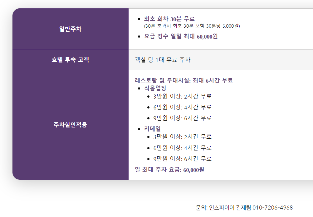 - 주차 할인: 투숙객이나 식당, 쇼핑몰 이용 시 이용 금액에 따라 주차 요금 할인 혜택 제공.
