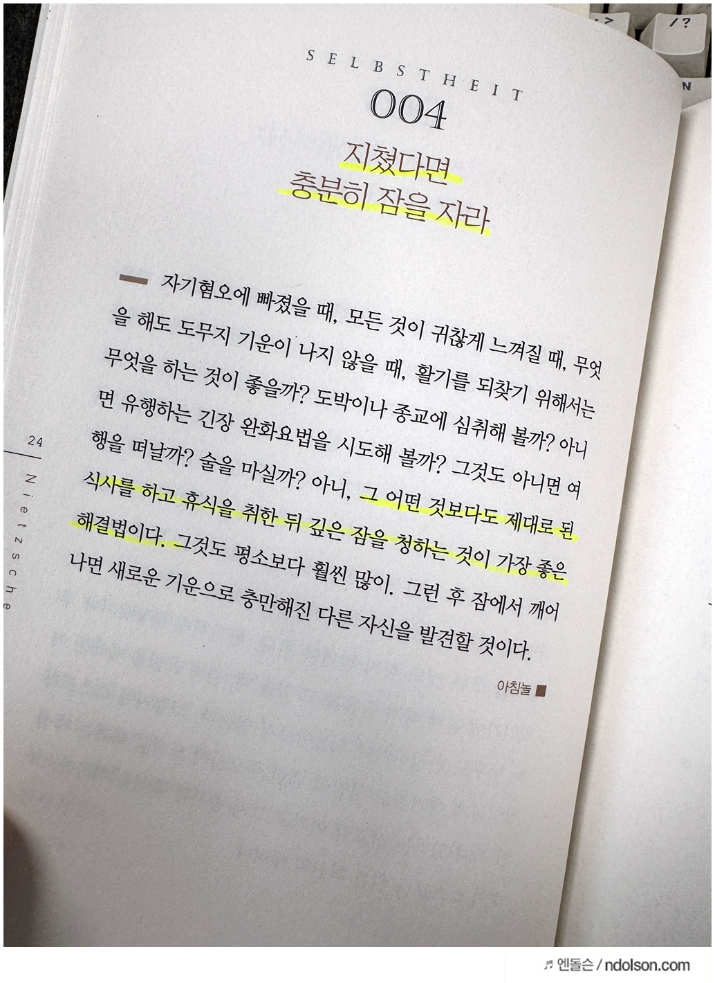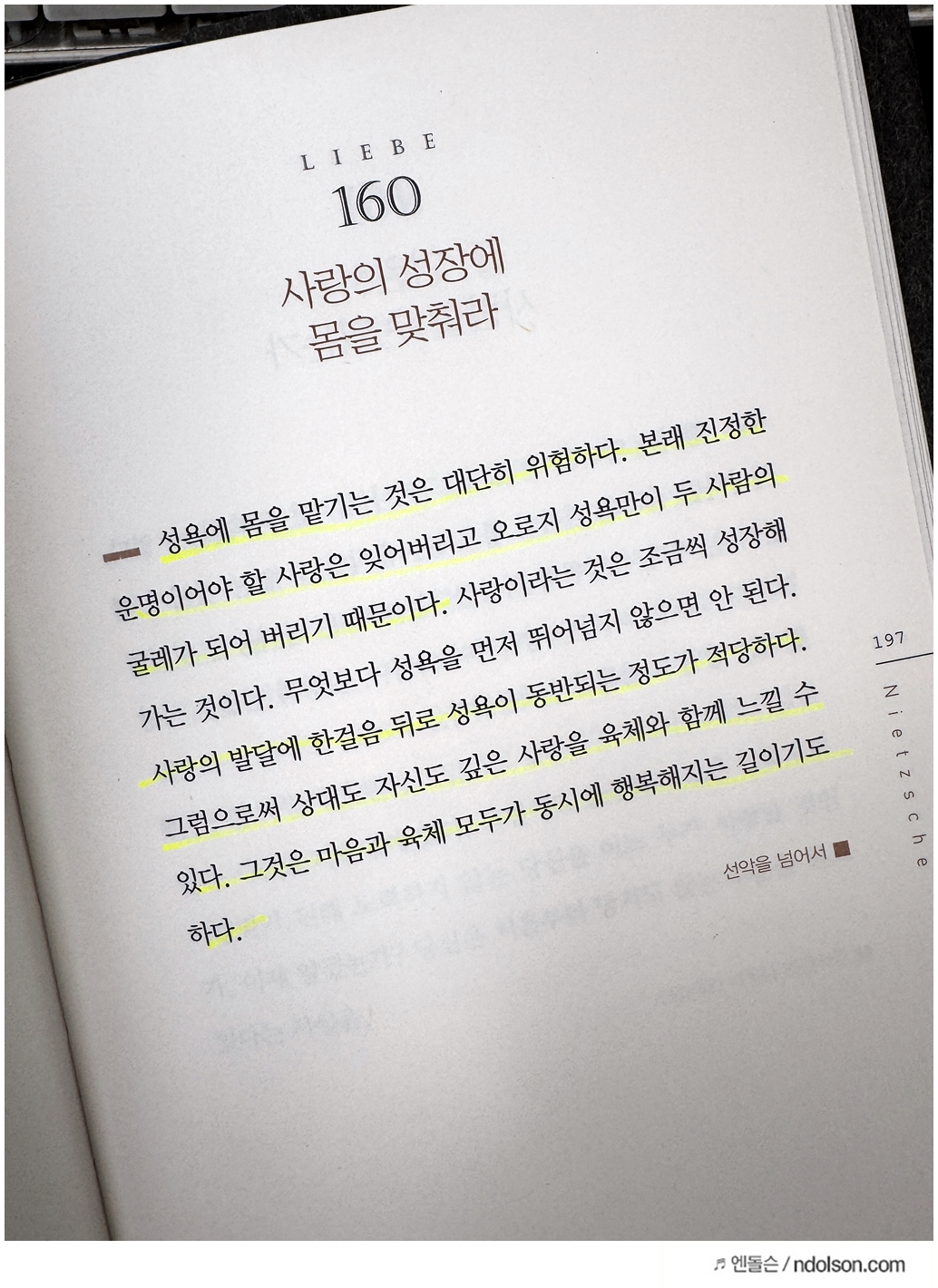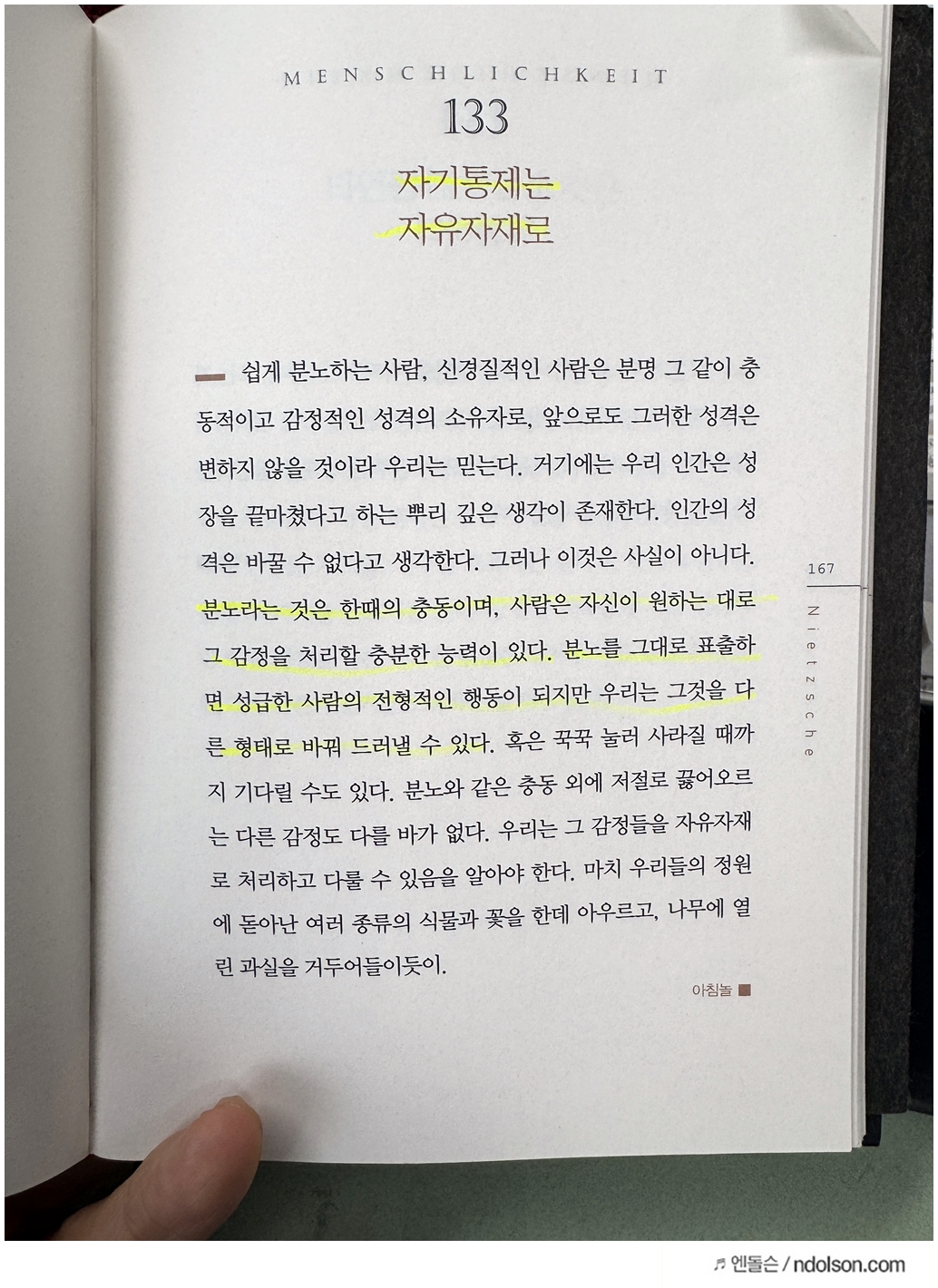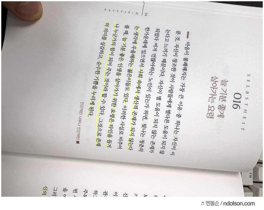 니체의 생각 책을 읽으면서 의미가 있는 부분에 습관적으로 형광색으로 줄을 쳐두었습니다.