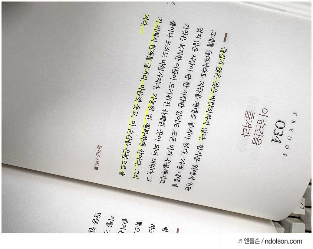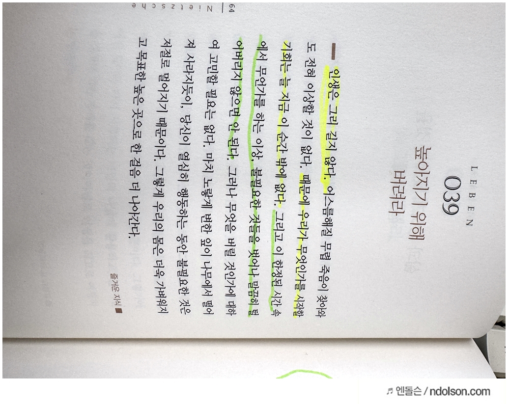 책을 다 읽고 또 읽을 때 매우 중요한 페이지에는 접어서 표시하고, 다른 형광펜 색으로 칠하면서 또 읽으면 좋았습니다.